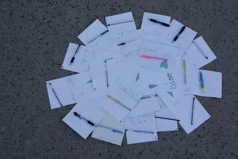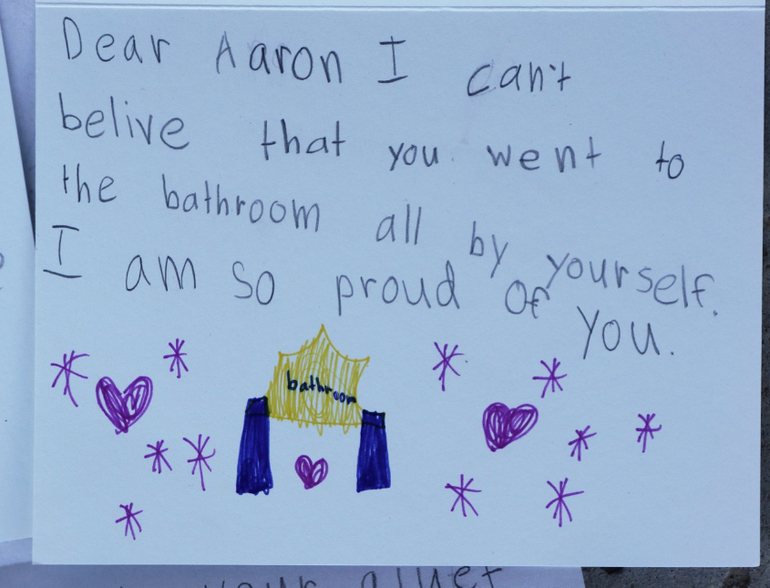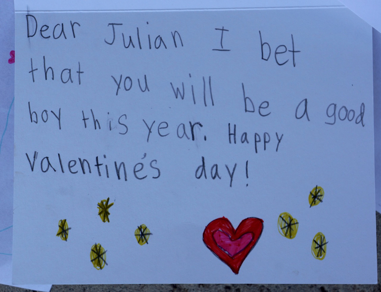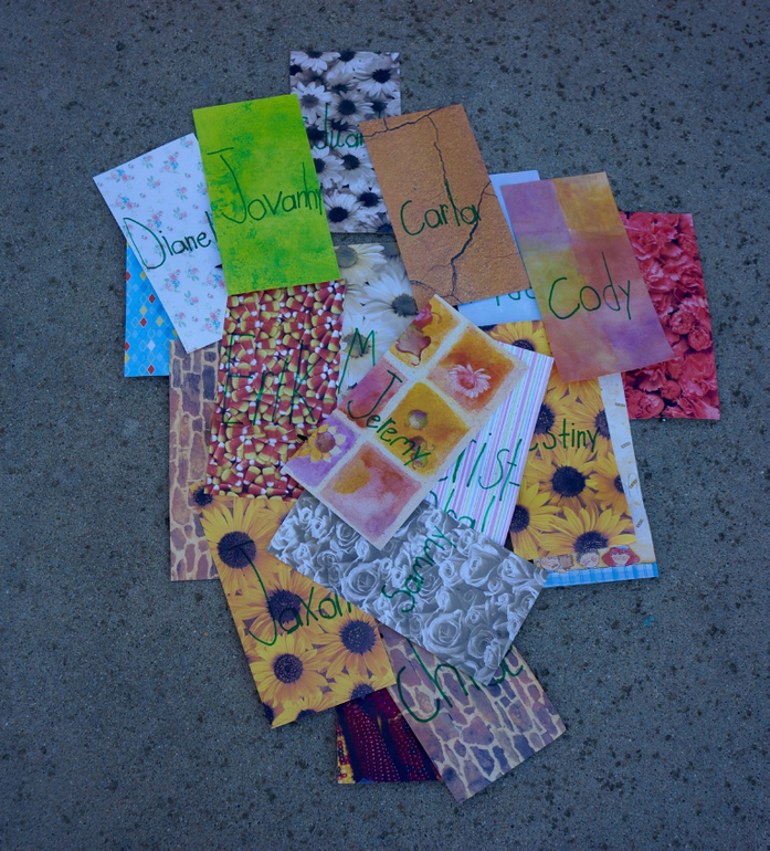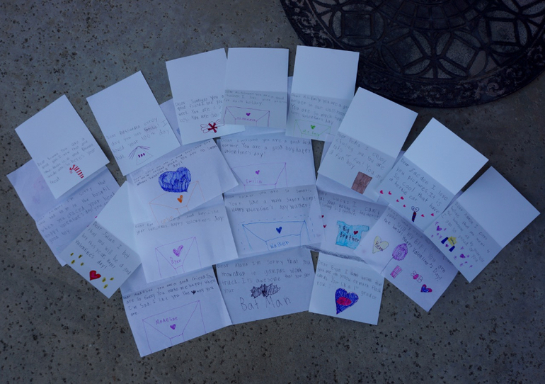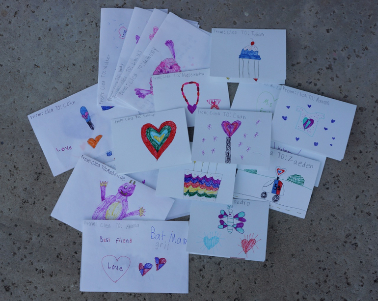 Джейд нашла бумагу с разноцветным принтом, настригла открытки. Каждую подписала, и скотчем прикрепила подарок - ручку (у нас их штук сто по дому валяется) Вся работа заняла у нее часа 3. Это подвиг со стороны Джейд, так как ей долго концентрироваться физически трудно.