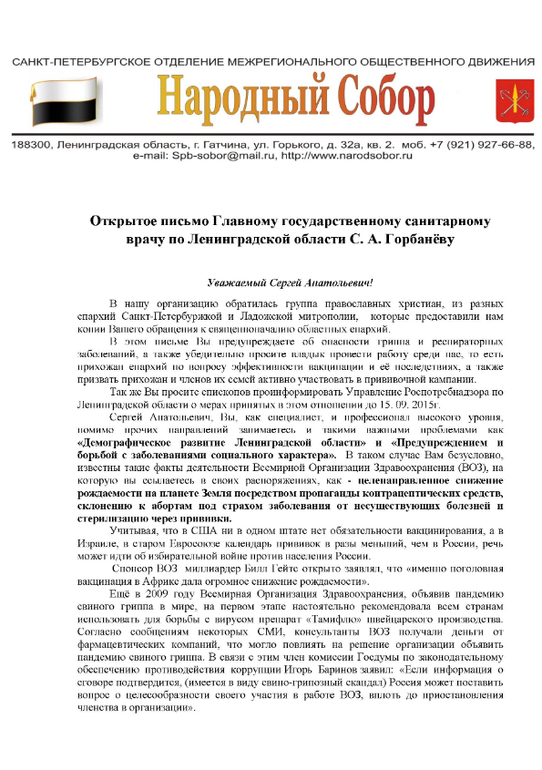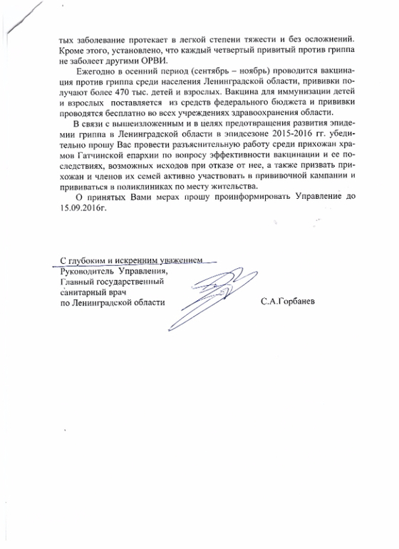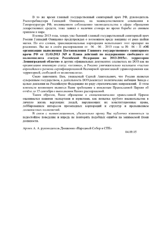 - мало того, что санврач Ленобласти считает РПЦ своим отделом, а епископат подчиненными, что видно из стиля письма и требования предоставить отчет о "принятых мерах" ограниченный сроком исполнения, попирая Закон РФ о свободе совести №50, забывая что Церковь государством же отделена от государства и его административной вертикали и бюджета на данную "разъяснительную работу",