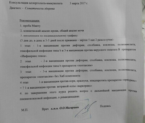 Мне Магаршак посоветовала очень хороший врач аллерголог-иммунолог Ищенко (принимает взрослых), да и в интернете о ней только положительные отзывы, она составляет индивидуальный календарь прививок.