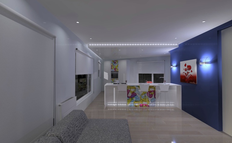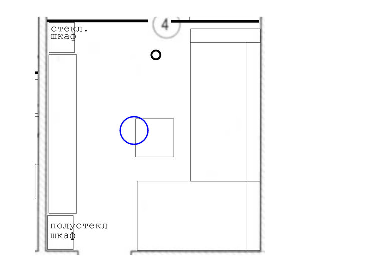 Ситуация такая: в комнате уже есть вывод под люстру (обозначена черным кружочком). Я хочу перенести люстру в место, обозначенное синим кружочком. Потолки уже отштукатурены, побелены, т.е. штробить и выводить провод не варинт (это было бы проще всего). В итоге у меня идет провод по потолку. Как его можно замаскировать? Расстояние между ними примерно 1 метр.