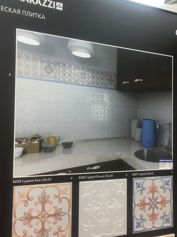 Купила эту плитку для фартука с бежевыми вставками. По совету продаваца,планировала выложить фартук тремя линиями, 2 линии белой плиткой ( верхняя и нижняя) и посередине полоса вставок. Но сейчас засомневалась. Может кто выкладывал эту плитку у себя?