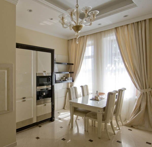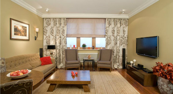 Цветом... Иногда возникает необходимость визуально уменьшить окна и опустить потолки. При больших окнах для занавесей стоит использовать активные цвета. Найдите ткань с яркими фрагментами (например, абстрактный рисунок) и сделайте штору по форме окна. Получится эффект витража. Хороший результат дадут и яркие вставки на уровне глаз. Они отвлекут внимание от высокого потолка.