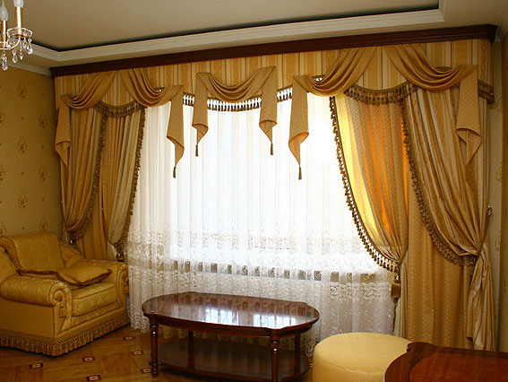 ... и кроем штор Визуально укоротить слишком высокое окно позволит конструкция штор. Так же как на длинную фигуру лучше надевать не платье, а кофточку с юбочкой, так и высокое окно лучше «разбить» цветом или фактурой. Как тут не вспомнить о ламбрекенах. Украсьте шторы ламбрекенами с оборками и кисточками. Глаз ловит кисточку и не ловит пространства...