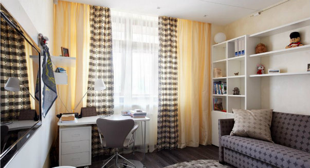 Если в маленькой комнате тюль висит строго по окну, или заходит на стены лишь на несколько сантиметров, маленькая комната выглядит еще меньше. В таком случае следует удлинить штангу, тюль дополнить плотными шторами, которые в раскрытом виде будут располагаться на фоне стены, и окно расширится.
