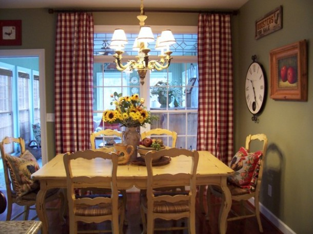 Текстиль и орнаменты. Текстиль в прованских столовых используется охотно и всевозможных орнаментов. Зачастую это простые натуральные ткани: лен, хлопок. Из орнаментов чаще всего можно встретить цветочные узоры, клетку, полоску.