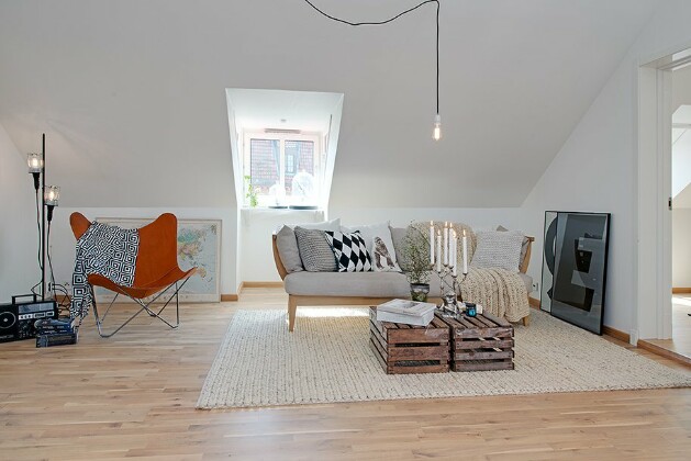 Итак, оформление гостиной в скандинавском стиле подразумевает белые стены (или светлого тона), мебель из бледного дерева (или окрашенная светлой краской), дерево, ламинат, или светлая доска на полу, намеренно простое оформление окон, ограниченная цветовая палитра, яркое освещение и большое количество источников света, открытая планировка.