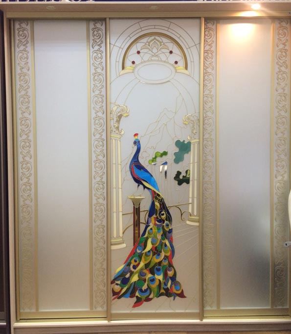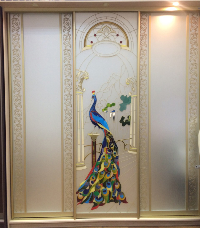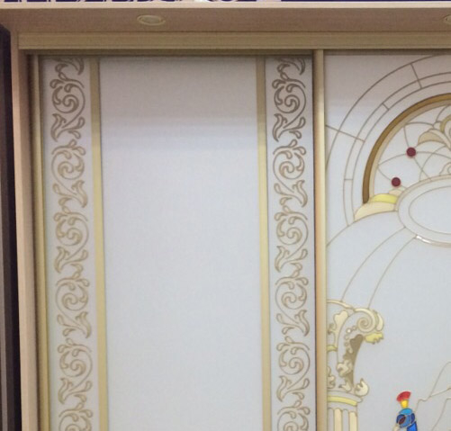 Двери могут быть украшены полимерным витражом (как на фото), это может быть стекло лакобель, зеркало, эмаль, дсп и т.д.