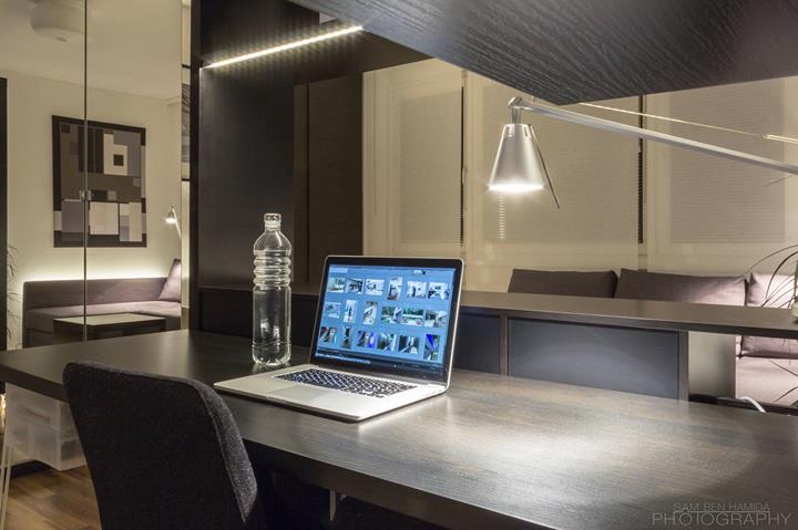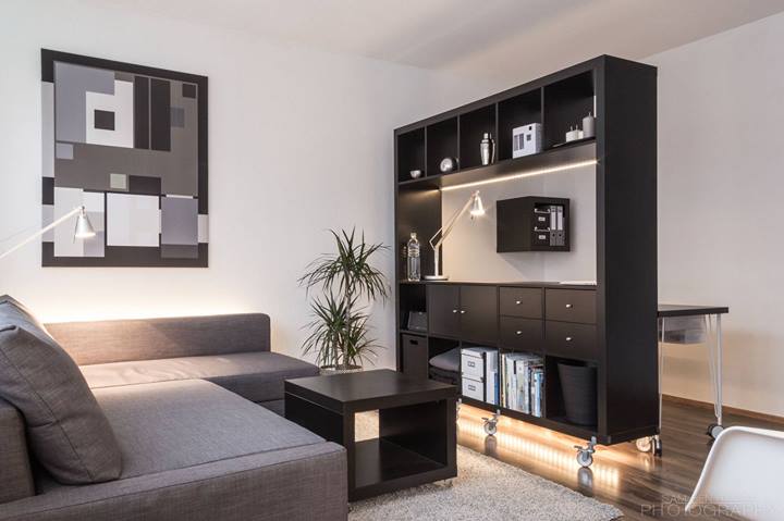 В квартире площадью в 24 кв. м., потеря места, которое занимает постель, может быть огромной в дневное время (если только вы не студент, который много спит). В этом случае, мультифункциональность является ключевой задачей. Если потолок достаточно высок, Вы можете сделать спальное место на втором уровне. Если это невозможно, как в этом случае, подумайте о диване-кровати. В настоящее время, диваны-кровати стали вполне комфортными и простыми в обращении. Ведь Вы не хотите, постоянно находиться в комнате, которая выглядит как спальня, особенно, если Вы планируете там работать.