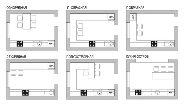 Переходя непосредственно к выбору планировки, следует учитывать характеристики имеющегося помещения. Именно его площадь и габариты определяют расположение кухонной мебели и оборудования. Основных типов кухонной планировки шесть.