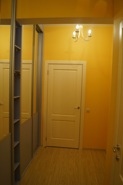 Даже в коридоре дали волю фантазии. Плитка у порога - винтажная, небесно-голубая, а стены - ярко песочного цвета, светло-оранжевые. Дополняет голубизну плитки встроенный шкаф небесно-голубого цвета.Ванна