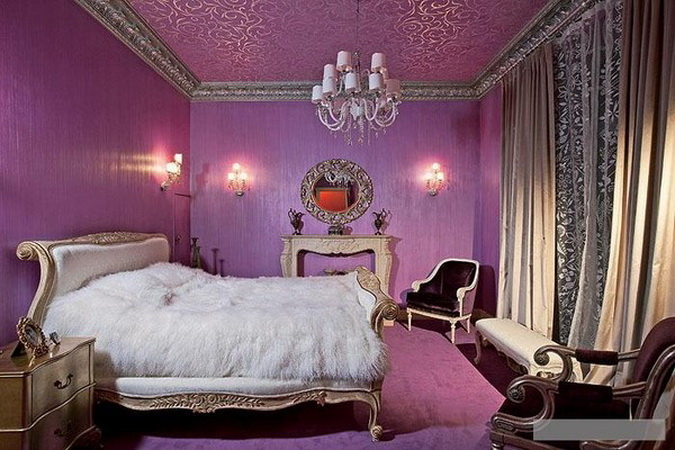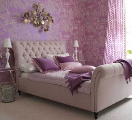 В интерьере спальни основной цвет - ярко лиловый, насыщенный и теплый. Такого цвета и обои под покраску, и цветы на обоях сверху. Поскольку комната небольшая, и цвет обоев достаточно насыщенный, остальные тона не контрастные - бежевый (шторы), кремовый дуб (встроенный шкаф).