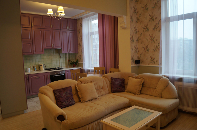 В интерьере кухни-гостиной использовали тона пастельно зеленый и лиловый, кухонный гарнитур, шторы, цветы на обоях, подушечки на диване - лилового цвета. Обои внизу (под покраску), фартук - пастельно зеленого цвета. Таким образом, два этих цвета удачно контрастируют с друг другом, в комнате не скучно, но при этом тона не слишком броские, от них не устают глаза. Все остальное в комнате - цвета антик, слоновой кости. Ригель между зоной кухни и зоной гостиной обыграли как арку при помощи декоративных кронштейнов. В зоне кухни плитка, теплый пол, причем плитка под старину, затертая.