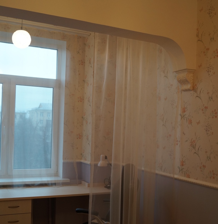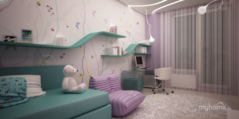 В детской комнате у нас нежнейшие обои с цветами фиолетового и персикового цвета. Поэтому основные тона детской - это контрастные персиковый (диван, шторы, тюль) и голубо-фиолетовый (обои под покраску внизу). Комната вытянутая, поэтому ее разделили визуально на две зоны: у окна (зона кабинета) большой рабочий стол, зона спальни-гостиной (диван, шкаф).
