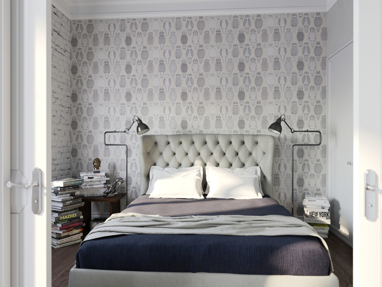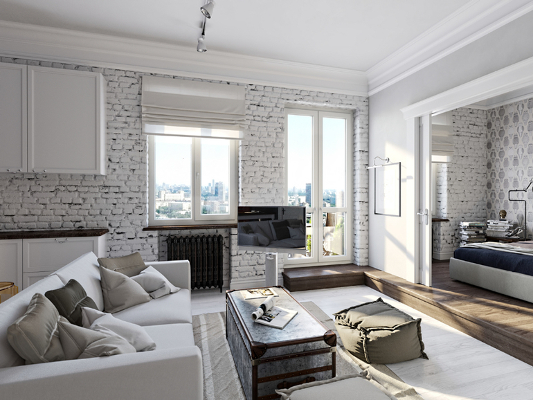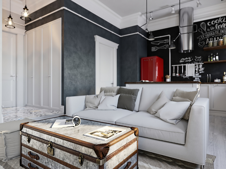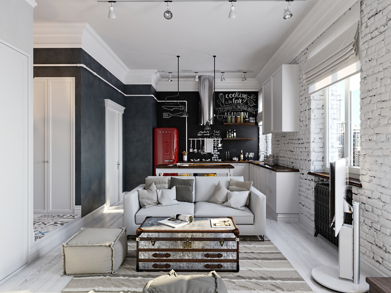 Несмотря на скромные размеры (чуть более 40 кв. м), интерьер этой студии вполне соответствует своему фасаду. Дизайнер Айя Лисова (Ayia Lisova) (в сотрудничестве с 3D-визуализатором Сергеем Башаковым (Sergey Bashakov)) объединила общие помещения воедино в лучших американских традициях, оставив изолированной лишь ванную комнату и спальню - большая кровать надежно укрылась от лишних взглядов за раздвижными дверьми. В интерьере присутствуют и другие черты, присущие так называемому американскому стилю: расположение мебели в центре гостиной, а не по стенам, светлый цвет отделки, обеденный стол, выполненный на манер кухонного острова, пузатый ретро холодильник Smeg, ролеты вместо классических штор.