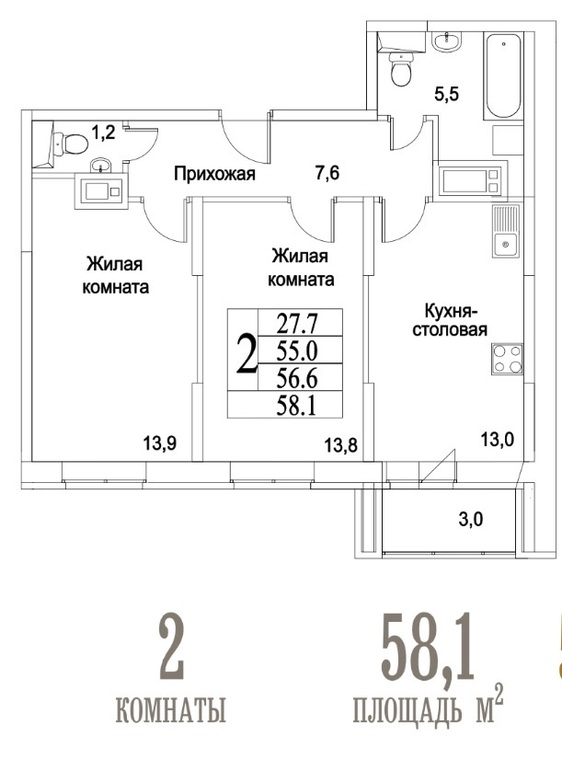 Жилую комнату 13.9 объединить с туалетом и частью коридора(где-то 16 получится, верно?) и сделать там кухню-столовую. Можно еще от 13.8 чуть-чуть отхапать. две отдельные комнаты - детская и спальня