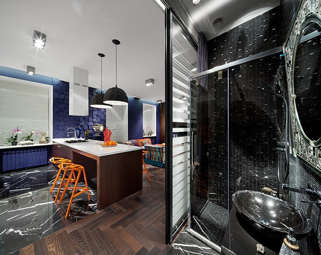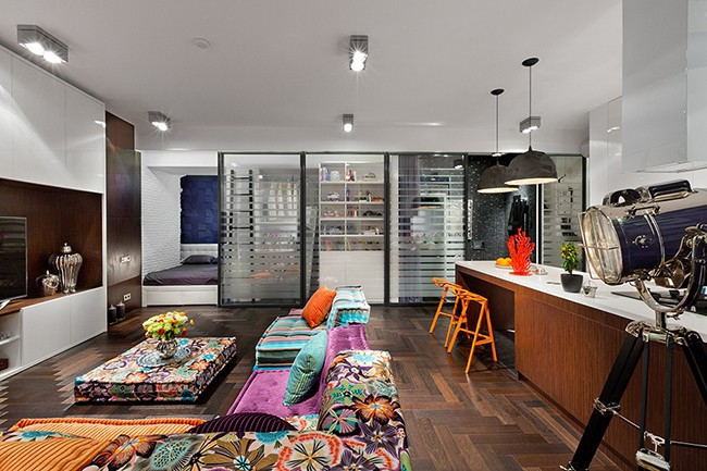 Часть пространства превратилась в ряд шкафов, скрытых за раздвижными стеклянными дверьми-купе: прямо у входа в гостиную размещается гардероб для верхней одежды, а также ванная комната с туалетом, душем и раковиной. Следующая дверь ведет в библиотеку, где книжные полки разместились от пола до потолка. Затем - гардероб, и, наконец, дверь в маленькую уютную спальню. Открытая гостиная зона состоит из кухни-острова с обеденной зоной и просторного дивана перед домашним кинотеатром.