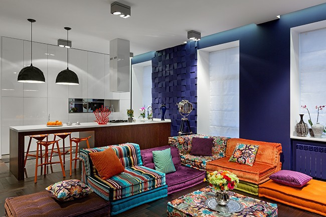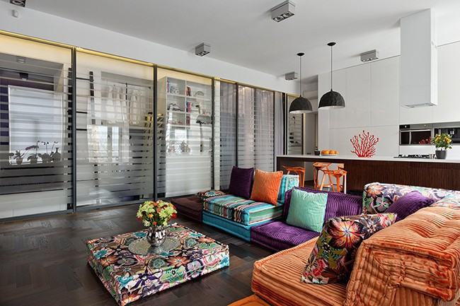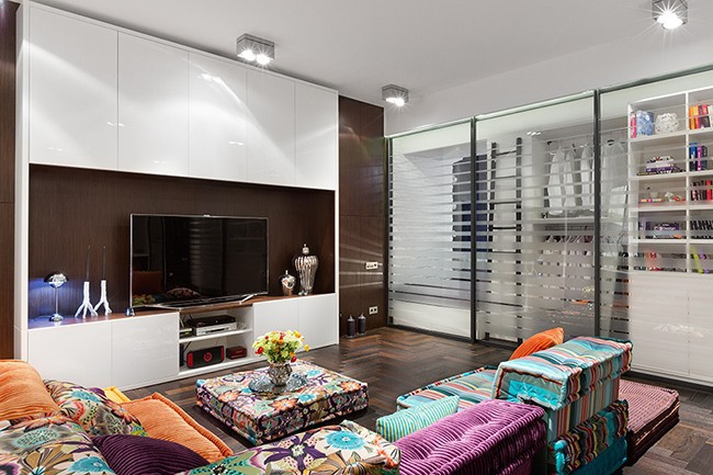 Несмотря на довольно ограниченную площадь этой квартиры, главным пожеланием заказчика было, чтобы в квартире размещалось всё необходимое : гостиная, кухня, обеденная зона, домашний кинотеатр, спальня, гардероб, небольшая библиотека и ванная комната.
