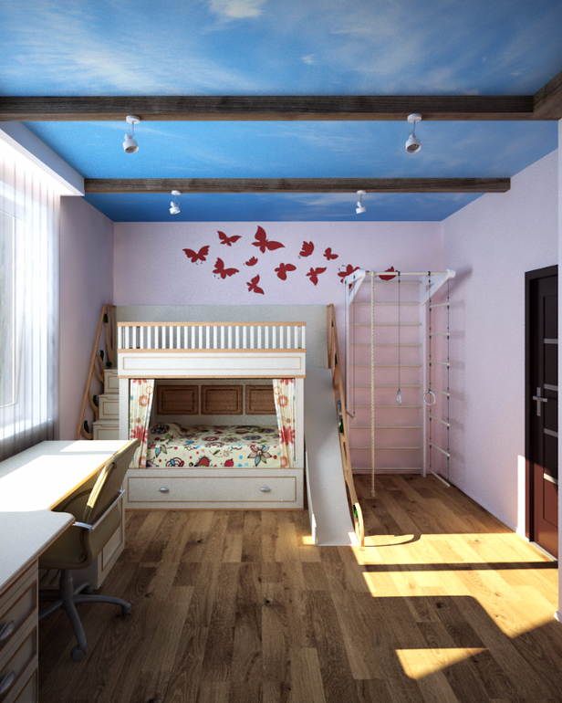 Здравствуйте. По практичности нравится. По декору не срвсем. Потолок выбивается немного от общей цветовой гаммы. Если возможно, то я бы добавила облаков, но в цветах заката ( розовый, сереневый) на скат стены с окнами. Тогла это больше бы связало во едино цветовую гамму обоев и текстиля. Или обои выбрать с большим содержанием голубых оттенков. Может Аля омбре с насыщенного голубого сходящего на нет к потолку. В спортивном уголке можно добавить мягкий мат подходящего оттенка. На место бабочек полки с лицевой расстановкой книг или меловая доска/магнитная стена для творчества.