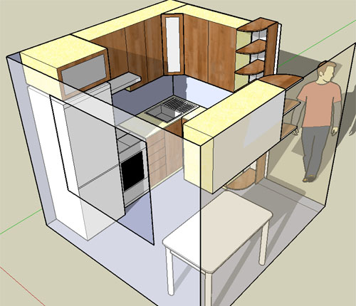 - увеличить полезную площадь на маленькой кухне поможет применение выдвижных и раскладных столов, а так же компактное расположение бытовых приборов;
