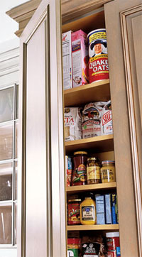 - установите высокие навесные шкафы и храните в них предметы, расположив их по высоте - чем реже вы пользуетесь предметом, тем выше он находится. Для редко используемых предметов, хранящихся на верхних полках, используйте складную лестницу или небольшую табуретку;