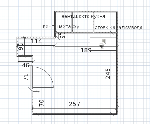 Унитаз условно включила, чтоб его кан.труба меньше места забирала, остальные трубы потоньше вроде. Не принципиальное место.