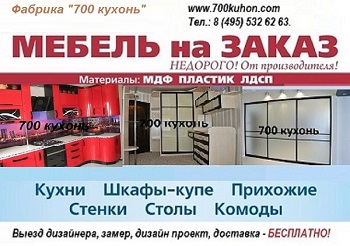 МебельПодмосковная фабрика мебели "700 кухонь" предлагает: кухонные гарнитуры, шкафы - купе, детские на заказ. Без посредников и переплат!!!