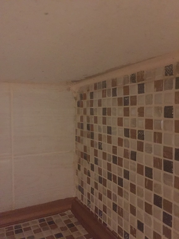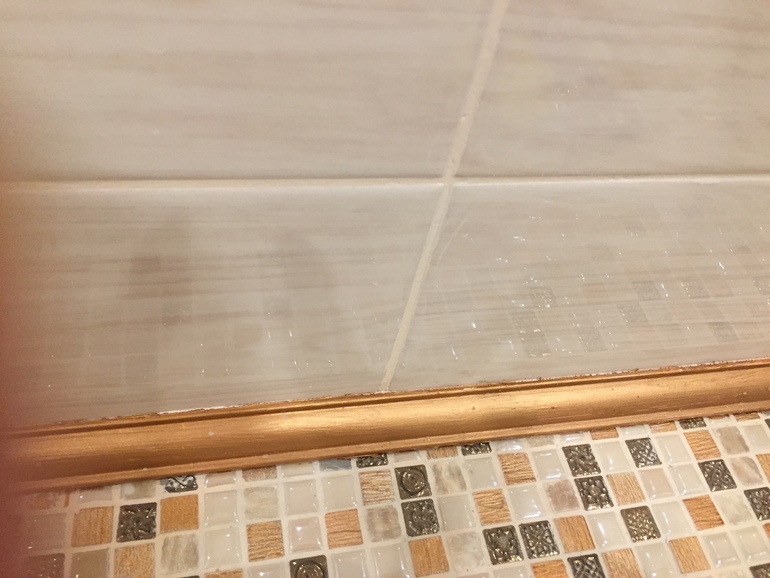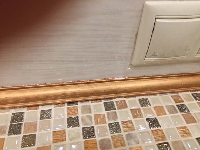 Мозайку клали на ГВЛ. В результате их работы, мозайка положена очень не аккуратно, особенно на стыках. Их решили замаскировать пластиковыми молдингами и покрасить их в цвет бронзы. Покрасить аккуратно не получается даже с 5 ой попытки.