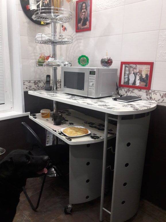 это барная стойка которую решили взять вместо стола.очень удобно) нижняя часть выкатывается к окну и мы все помещаемся)