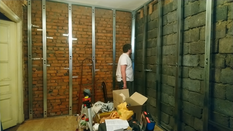 Две стены к соседу: одна кирпичная, вторая керамзитобетонные блоки. В планах было это заштукатурить, но после увиденного энтузиазм как-то пропал и грянула новость о реновации.