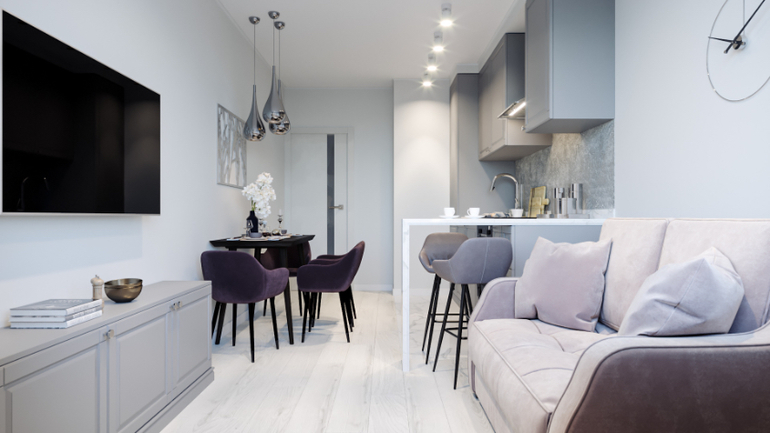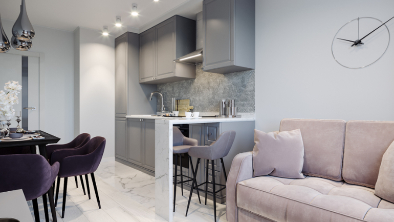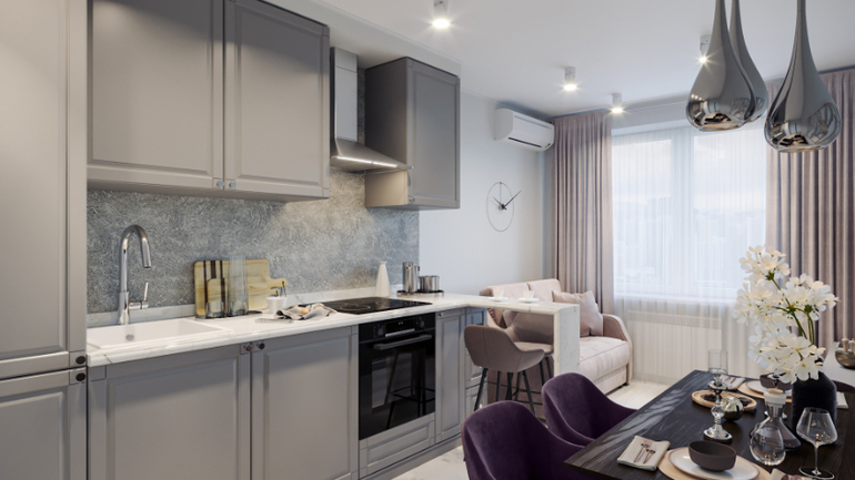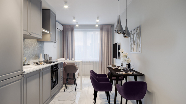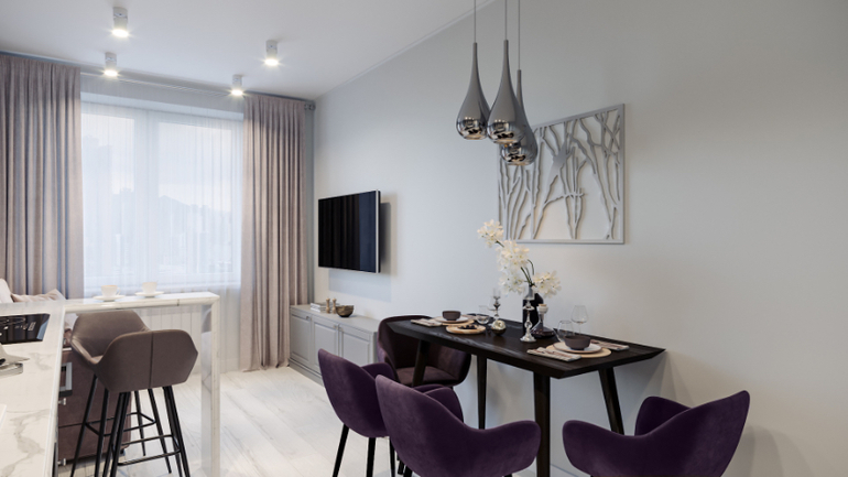 Очень мило и красиво. Мне не нравятся остро две вещи: кухня в линию и обедать носом в стену.