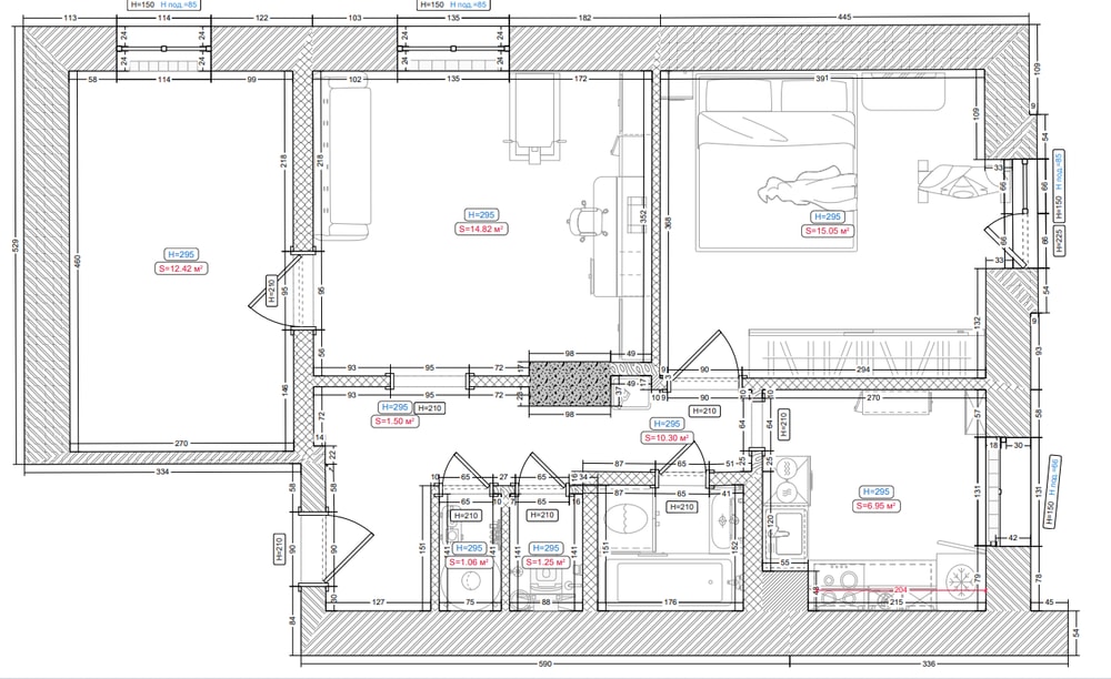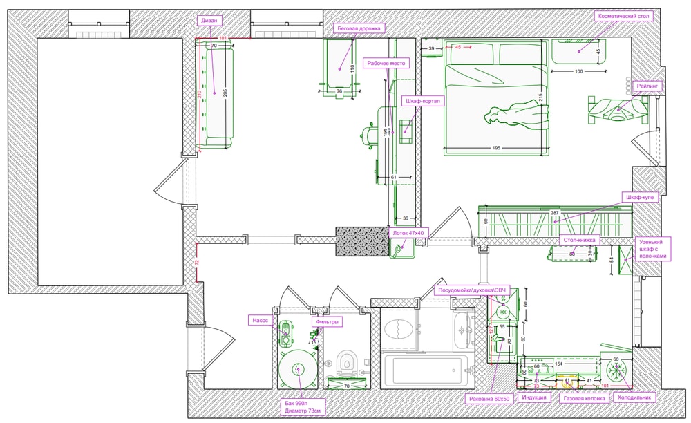 4)В кухню нужно впихнуть колону из посудомойки+духовка + СВЧ, холодильник полноразмерный 69 глубина х 60см ширина, раковину хотя бы 60х45см и место для рабочей зоны оставить на 1 человека буквально. Стол планируем навесной раскладной, ибо почти не едим на кухне и особо не вижу вариантов как его поставить чтоб не упираться в него при входе.