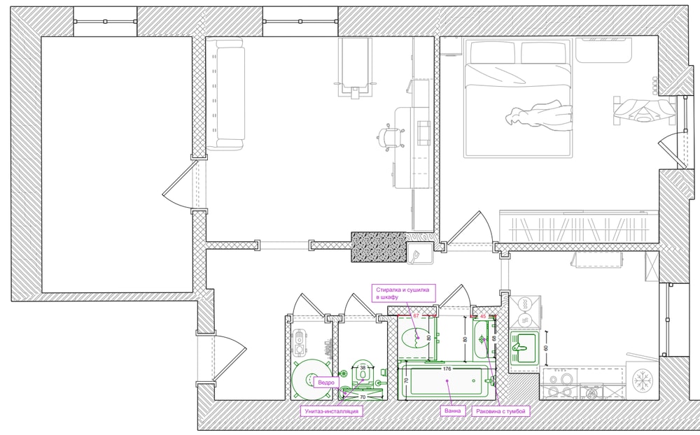 3)В ванную нужно впихнуть ванну, колону из стиралки и сушилки и раковину с тумбой