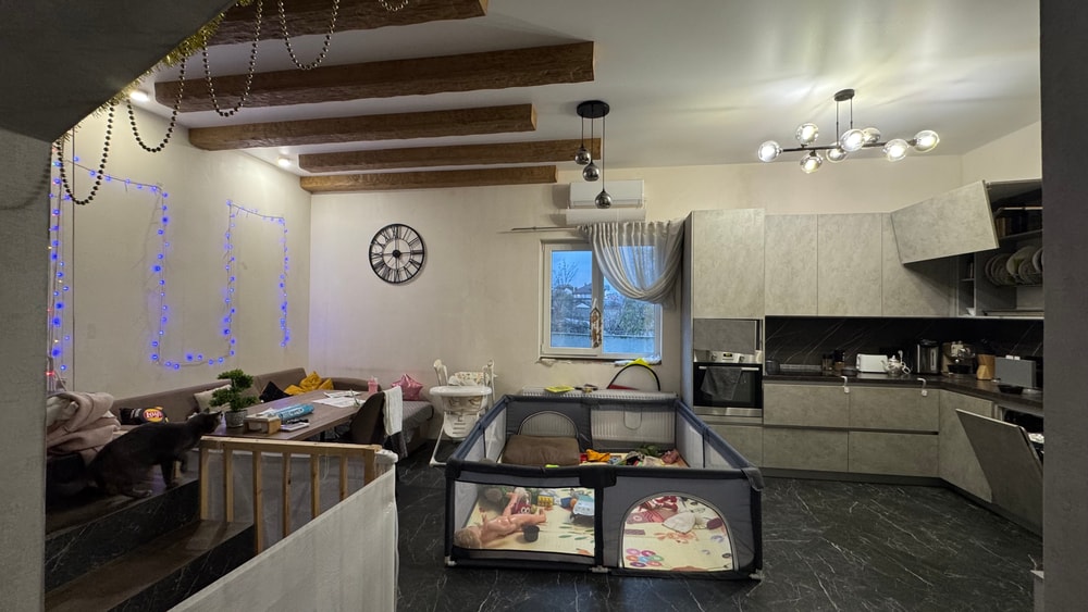 Ремонт на кухнеИтак . Интерьер не должен выглядеть супер домашним . Кухня скрыта будто просто шкафы . Когда нибудь обеденная зона организуется напротив окна , пока она просто занята . А на левой стене диваны низкий столик ноут .