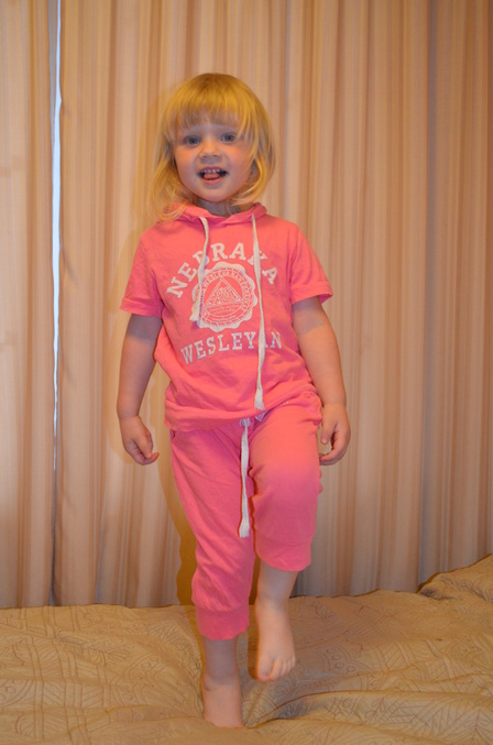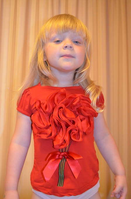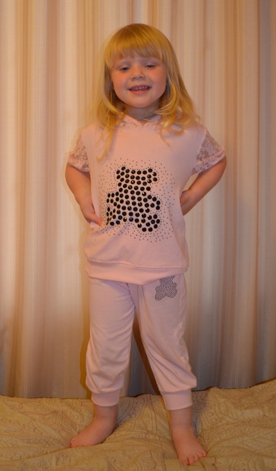 Розовый костюмчик на 110см. Запас хороший, на след год точно бы смотрелся лучше, но материал тонкий, боюсь этим летом износится.