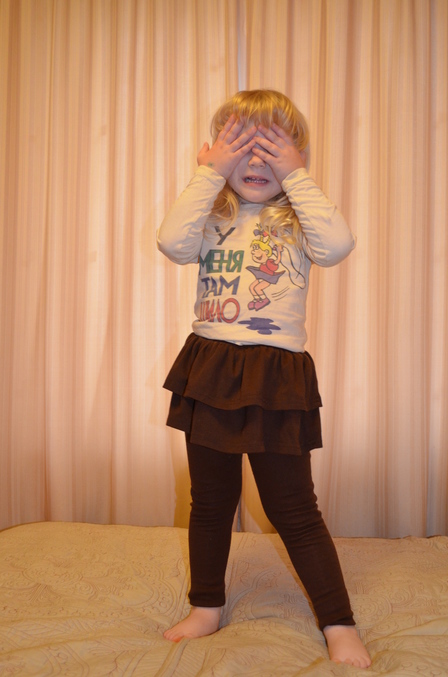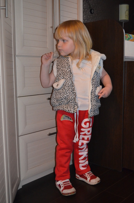 Лосины с юбкой. Тоже 110 и с огромным запасом. Лет до 5 проносим, если материал выдержит. Относительно тонкий трикотаж. На худышке смотрелись бы еще ужаснее, т.к. лосины сидят скорее как свободные рейтузы. Они удобны - колготки+юбка в одном флаконе. Обязательно закажу к сентябрю (для сада) еще, только нашего размера.