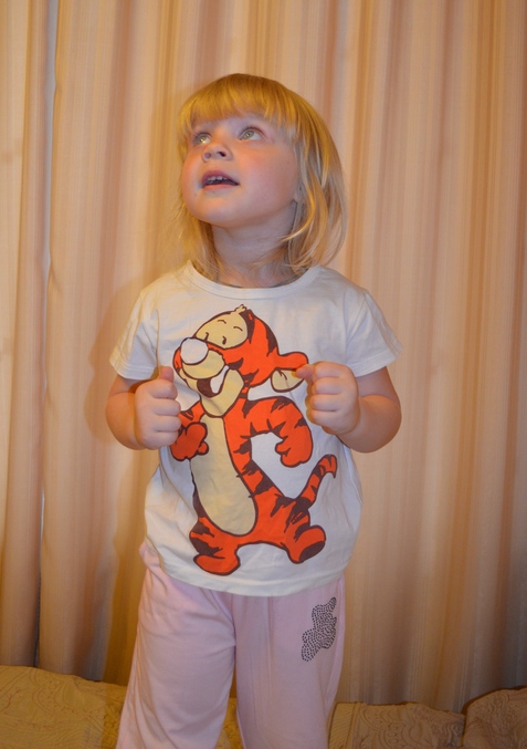 Футболка с Тигрой - одна из немногих вещей на 100см. Сидит идеально. Тонкий трикотаж (может немного вискозы, не пойму, чуть тянется), оч яркий рисунок.