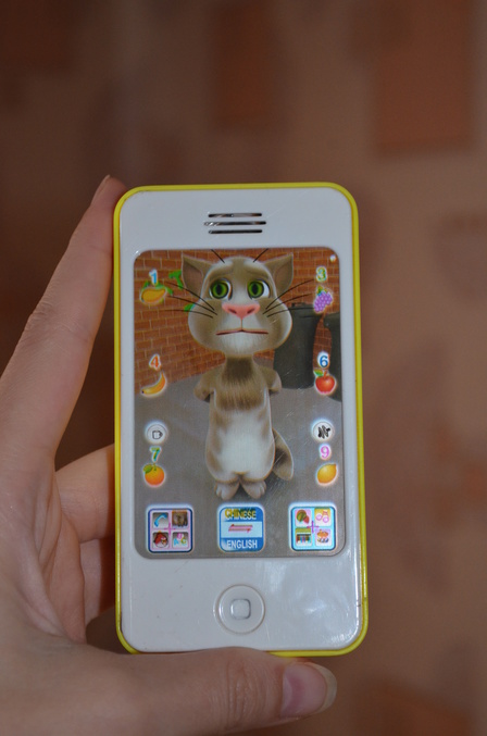 Детский айфон. Вместо экрана обычная наклейка со всем известным котом Томом. По центру одна кнопка вкл/выкл. Еще кнопки тактильные (невидимые) на самом экране. Много звуков, большенство из эпловских игр. Для ребенка хорошая игрушка, нам понравился.
