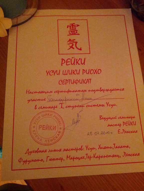 Раньше сертификатов не давали, это только недавно Министерство здравоохранения приняло решение, что Рейки официально признано видом лечения, и разрешение для проведения таких сеансов должно быть в виде сертификата, подтверждающего, что этот человек умеет может оказывать услуги в виде лечения с помощью Рейки.