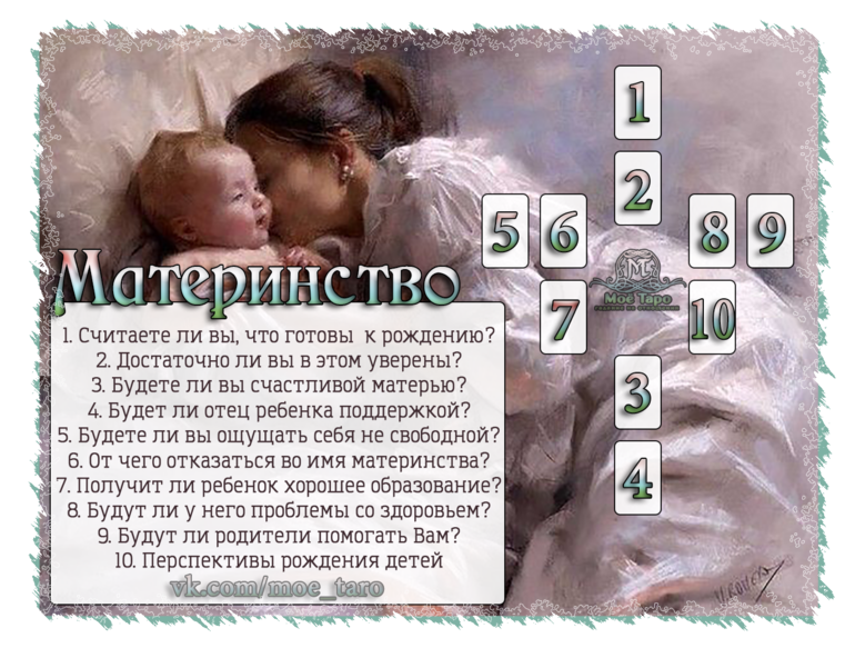 С одной стороны, расклад интересен тем, что позволяет произвести своеобразную психологическую диагностику по поводу того, готова ли женщина иметь ребенка. С другой стороны, он показывает и материальные перспективы его рождения, стоит ли, например, рассчитывать на чью-то помощь. Иначе говоря, расклад исключительно женский и отражает основные вопросы, волнующие женщин в последние месяцы беременности.