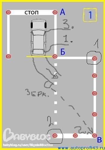 Номер 2.: смотрите в левое (водительское) зеркало. Как только в нём появиться стойка №2 вы возвращаете руль в исходное положение (колёса полностью прямо)