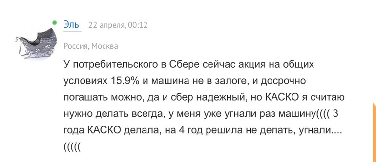 У потребительского в Сбере сейчас акция на общих условиях 15.9% и машина не в залоге, и досрочно погашать можно, да и сбер надежный, но КАСКО я считаю нужно делать всегда, у меня уже угнали раз машину(((( 3 года КАСКО делала, на 4 год решила не делать, угнали....(((((