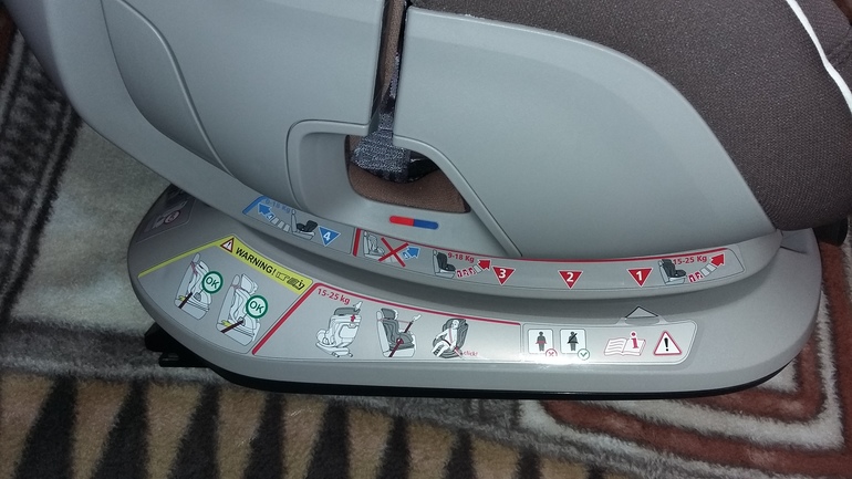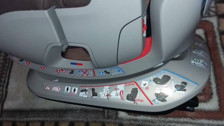 На боковых поверхностях основания кресла схематично изображено, как правильно установить и пристегнуть кресло для детей разного возраста и веса, и как правильно пристегнуть ребенка в нем.