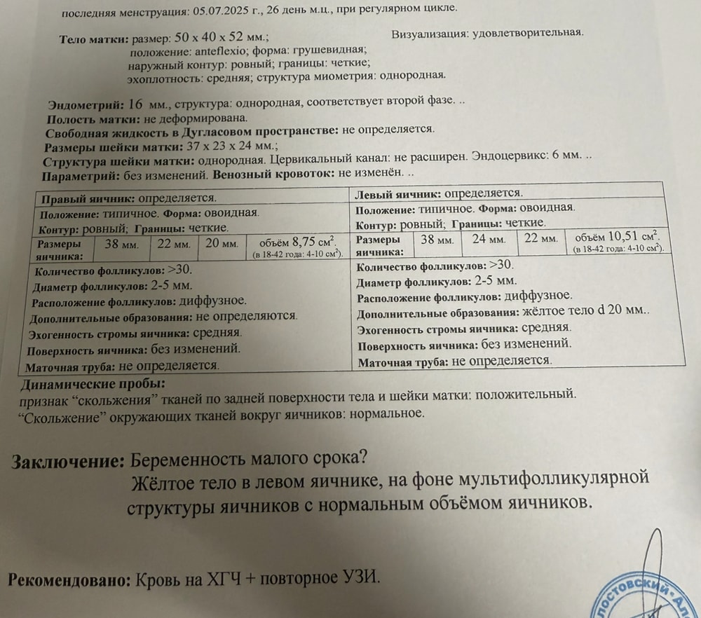 АнализыВсем добрый день! Я в полном замешательстве…С мужем не планировали заводить детей, но подсознательно к этому готовы, но намеренно не предпринимали каких-то попыток. 5 июля было начало последняя менструация, через 3 дня после завершения (13 июля) произошел незащищенный половой акт, но я не била тревогу, так как была убеждена, что можно забеременеть только во время овуляции, так как сразу после менструации забеременеть большая редкость!29 июля(+-8 дней до задержки) вечером просто для своего успокоения решила сделать электронный тест, показал + 1-2, на следующий день побежала в другую аптеку, купила еще один чтобы убедиться что тест не бракованный. Следующие два электронных теста показали такой же результат (+1-2 недели). Побежала сразу на узи, сдала хгч. Приложу фото тестов, узи (апрель для сравнения с последним предыдущим), узи (30 июля) и результат ХГЧ. Я не понимаю как такое может быть если везде говорят, что в крови хгч должен появиться раньше чем в моче??Я конечно начиталась в интернете, что таких случаев миллион и еще очень маленький срок, задержки еще не было, до нее неделя , но все же напрягалась, пойду пересдавать хгч. Подруга успокаивает, так как на 1 день задержки у нее был хгч <1,2, ей предложили чистку, а сейчас этому хгч 3 года…Для меня чудо и то, что случилось оплодотворение-по моим догадкам просто возможно была ранняя овуляция.
