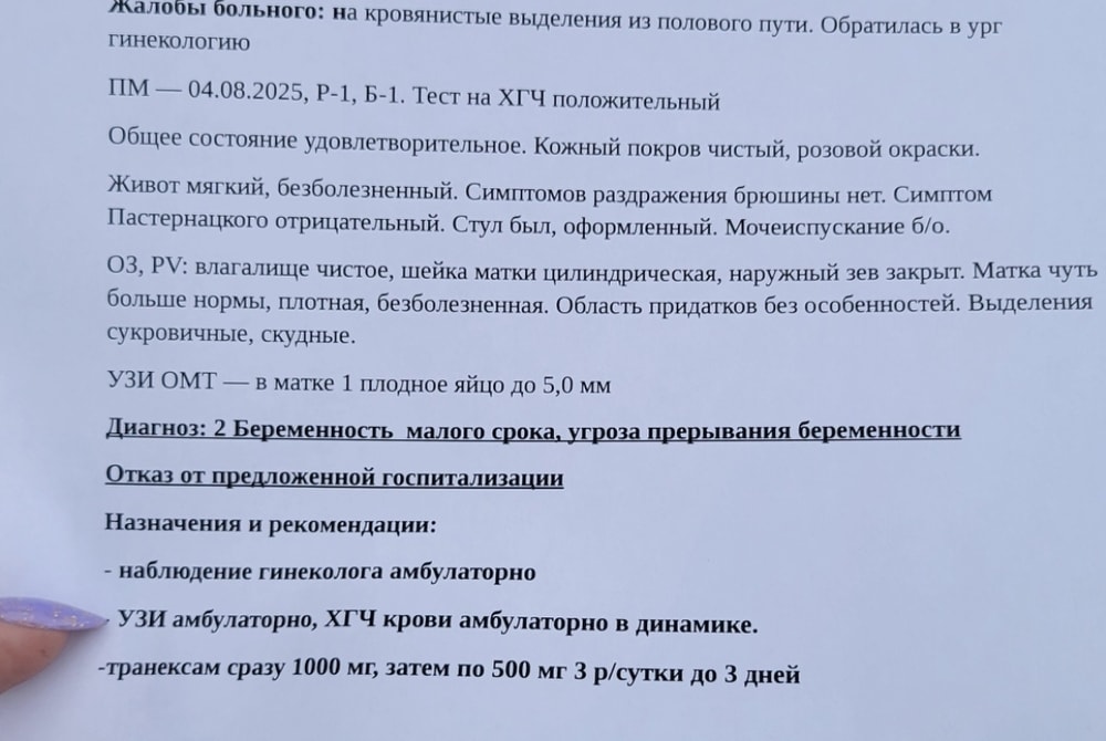 Зря вы отказались от госпитализации, за вами там бы наблюдали и делали узи каждую неделю чтоб смотреть развивается ли эмбрион. А если у вас и кровотечение то темболее надо было ложится.