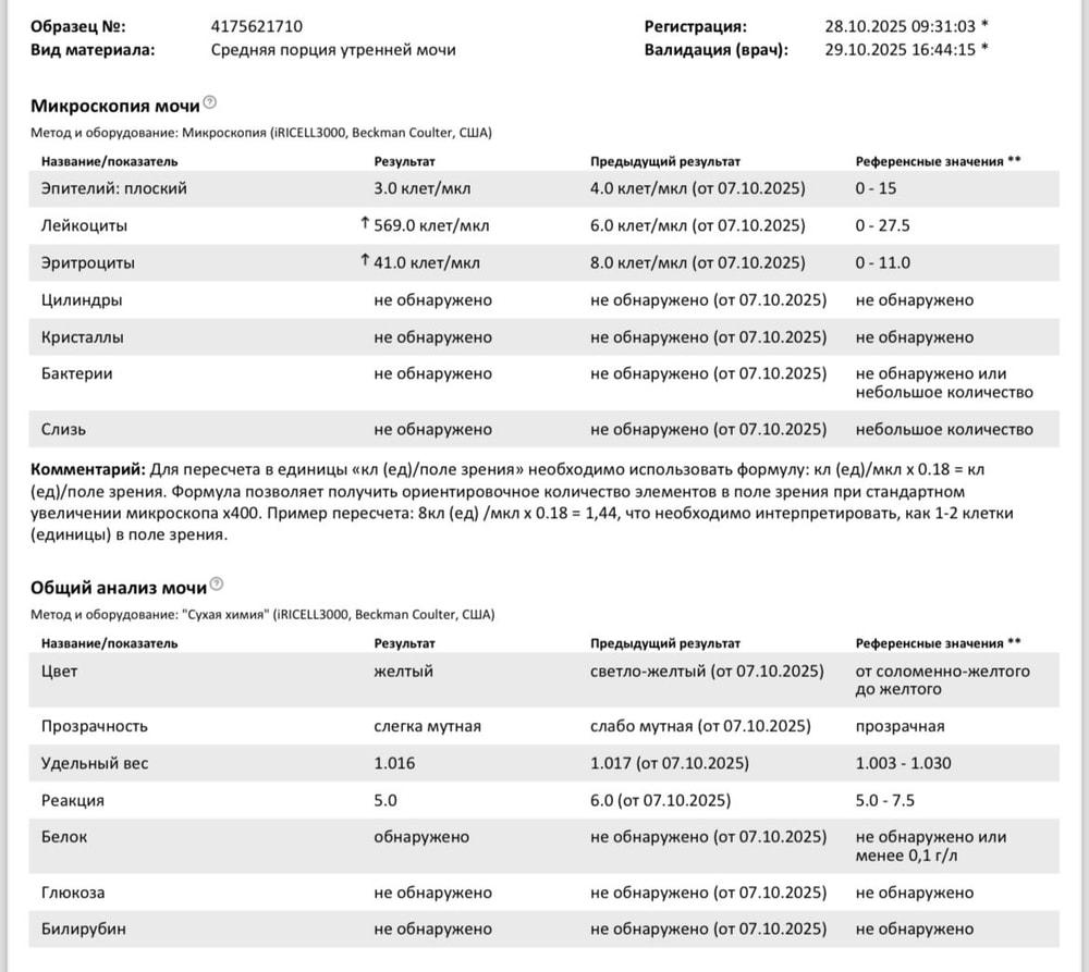 Сразу побежала сдавать анализы . Муж как всегда все в норме. . У меня в моче просто кошмар какой-то .Лейкоциты 560 при норме до 24 . ( хотя 7 октябрь все было идеально)