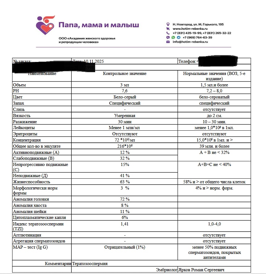 Неопытным взглядом – вроде все нормально. Как сдадим остальные анализы, поедем в клинику к андрологу за заключением, врач – Ходак Владислав Артурович.