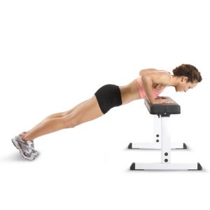 Первое время вам может быть сложно отжиматься от пола. Поэтому сначала отжимайтесь от стола, потом - от дивана, а затем - от пола. Спина и ноги при отжимании образуют ровную прямую линию. Ноги вместе, на носочках, руки - чуть шире плеч. Голова смотрит вперёд. Опускаемся почти что до касания пола грудью.