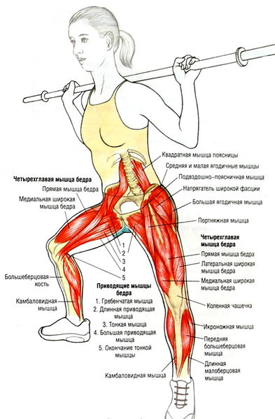От того, какая техника соблюдается во время приседаний, зависит, какие мышцы получат бОльшую нагрузку.