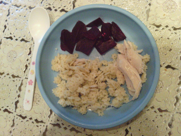 ужин: макароны-зведочки,вареная свеколка и вареная курочка.запили потом соком.перед сном сегодня ничего не пили.