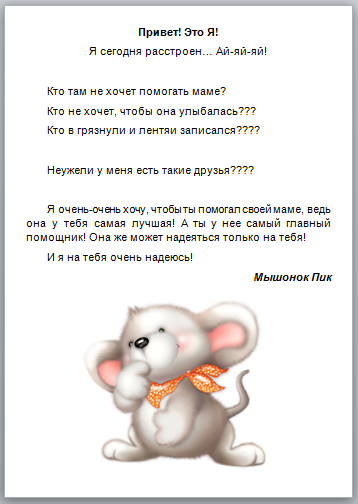 Пару слов хочу сказать по поводу поощрения детей за выполненную работу и про уборку вообще. Я считаю, что ребенок начиная примерно с 2-х летнего возраста должен выполнять дома определенные дела. Например, собрать игрушки после того, как поиграл. Пусть в начале ему помогает мама или старшие дети, но это дело, которое нужно делать всегда. Поиграл - собери. Участие в марафоне подразумевает выполнение заданий от ведущего, а для ребенка - от мышонка. Не лишайте детей элемента игры. Ваши задания они и так выполнят, потому что вы для них авторитет, а вот задания от мышонка - это игра, которая прививает полезную привычку - "мама убирает в кухне и я в кухне помогаю убирать". Поэтому я бы советовала детям до 6 лет сохранять элемент игры, в этом возрасте всё, что подается как игра, запоминается быстрее. Теперь про поощрение. Я не буду спорить надо это или не надо, я придерживаюсь мнения большинства детских психологов, которые считают, что ребенок быстрее усваивает любое дело, которое подается по схеме "выполнил дело - получил поощрение". Именно поэтому нашу уборку с детьми я построила на поощрениях, маленьких сюрпризах... А вот что будет этим сюрпризом - решать вам))) Это может быть и сладкий приз, и игрушка, какая-то мелочь, нужная ребенку. Можно установить одно большое вознаграждение в конце недели за выполнение всех заданий. К слову, я практиковала использование вот таких табличек-поощрений, может, кому пригодятся. Мне понравилось, ребенок видит что он сделал, а что нет, и видит результат в конце недели. Ну вот как-то так))) Если у кого есть какие-то мысли по этому поводу - давайте делиться, обговаривать, искать истину! Ведь все мы стремимся к одному - приучить наших деток к порядку, к уборке)))